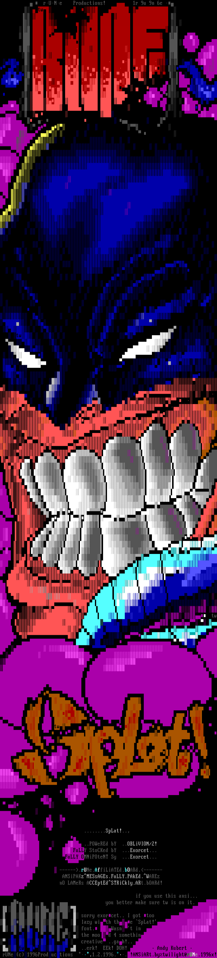 sorry exorcet.. I got too lazy with the SpLat! font. Wasnt in the mood 4 somethin creative ..gah!.. tw ..erk! EEk! DOH! Andy Kubert rUNec1996Productions .1.2.1996..!ANSiARt.bytwilight@rUNe.1996x