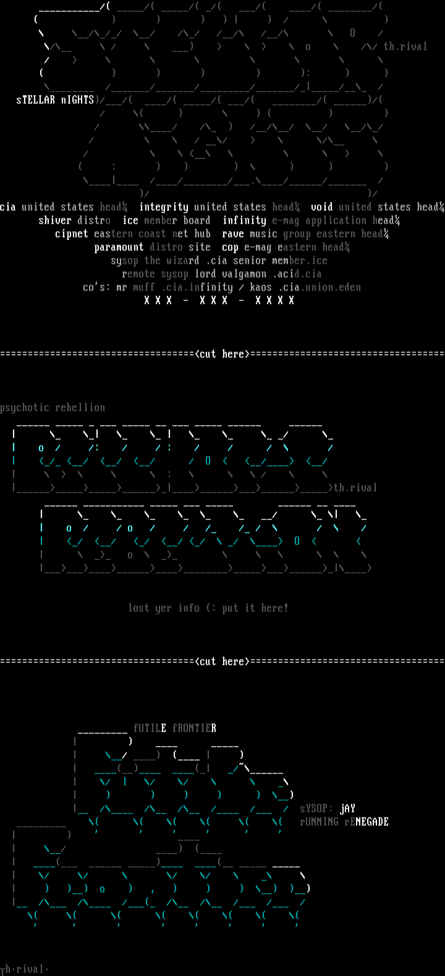 sysop lord valgamon .acid.cia cos: mr muff .cia.infinity / kaos .cia.union.eden X X X - X X X - X X X X