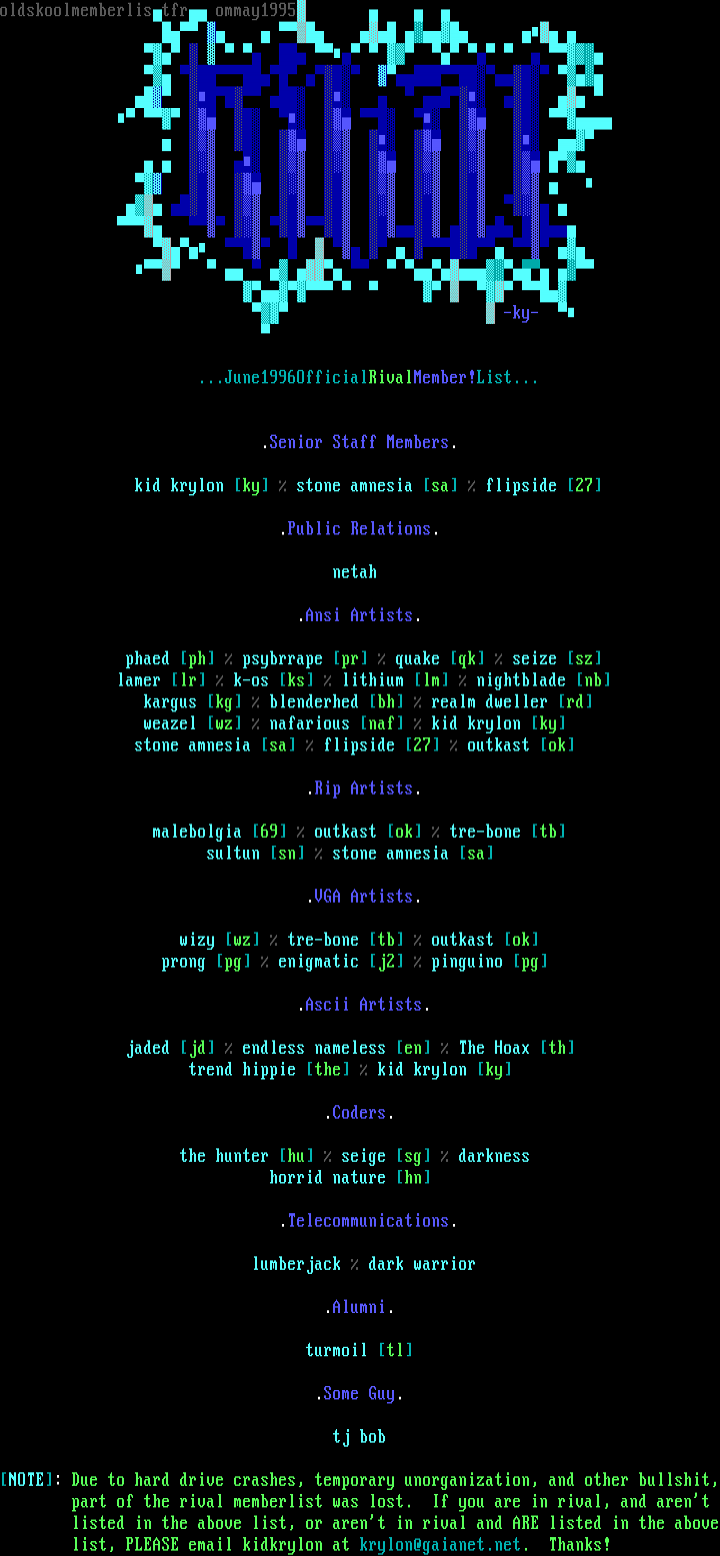 NOTE: Due to hard drive crashes, temporary unorganization, and other bullshit, part of the rival memberlist was lost. If you are in rival, and arent
