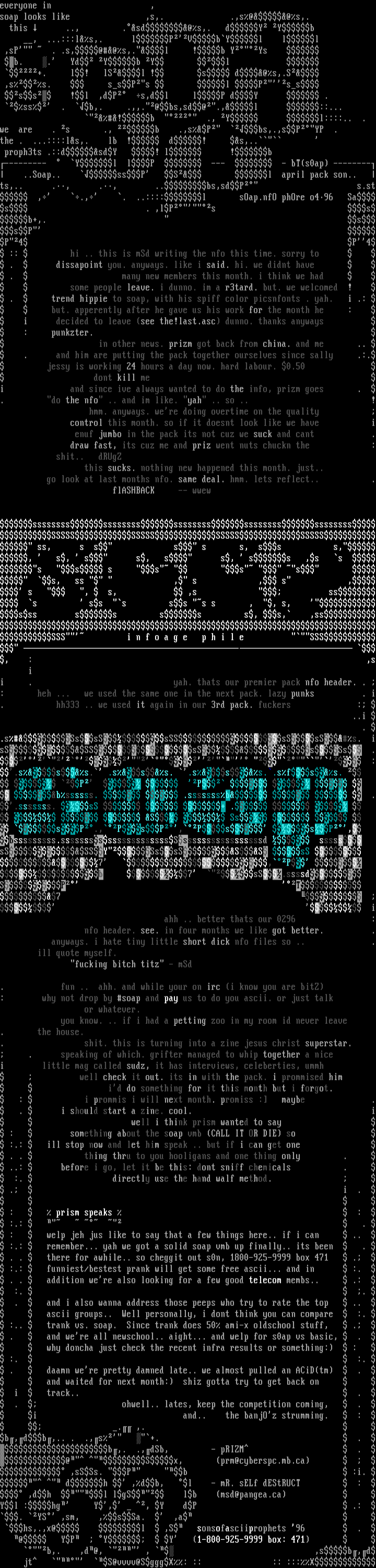 --------- Yl lP --- - bTs0ap -------- ..Soap.. ssP S l april pack son.. ts,.. ., ., ..bs,sdP s.st , ., . ..::::l sOap.nfO phOre o496 Sas . ,lPs sb+,. ssP P4 P4 :: hi .. this is mSd writing the nfo this time. sorry to . dissapoint you. anyways. like i said. hi. we didnt have . many new members this month. i think we had some people leave. i dunno. im a r3tard. but. we welcomed ! . trend hippie to soap, with his spiff color picsnfonts . yah. i .: but. apperently after he gave us his work for the month he : i decided to leave see the!last.asc dunno. thanks anyways : punkzter. in other news. prizm got back from china. and me .. . and him are putting the pack together ourselves since sally .:. jessy is working 24 hours a day now. hard labour. 0.50 dont kill me i and since ive always wanted to do the info, prizm goes . . do the nfo .. and im like. yah .. so .. ! hmm. anyways. were doing overtime on the quality control this month. so if it doesnt look like we have i enuf jumbo in the pack its not cuz we suck and cant . draw fast, its cuz me and priz went nuts chuckn the : shit.. dRUgZ