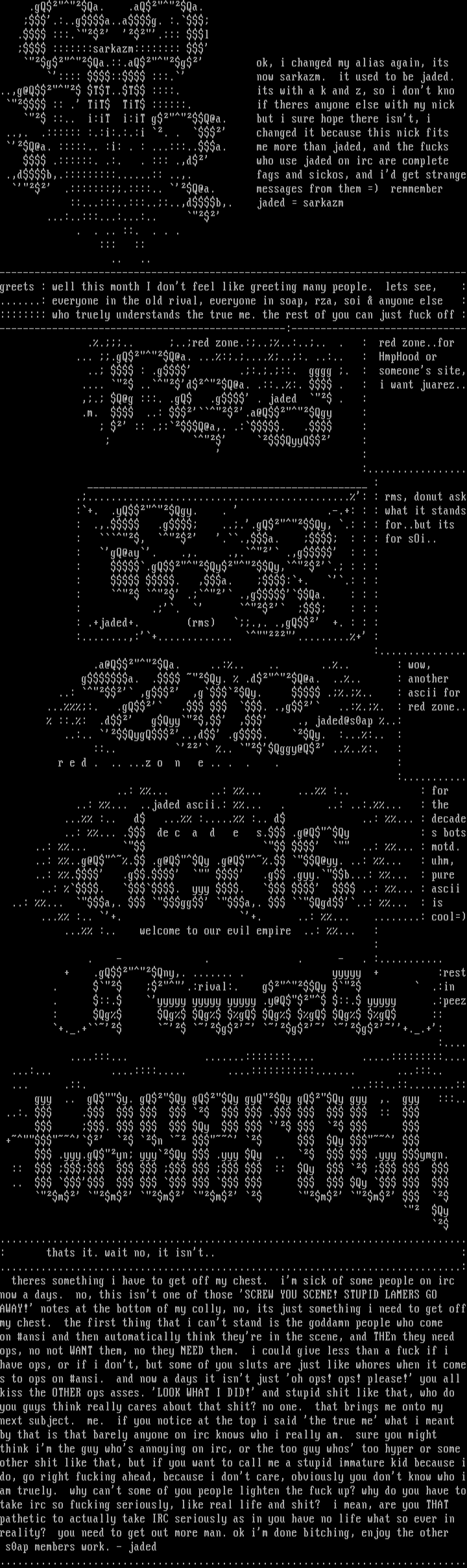 --------------------------------------------------------------------------------greets : well this month I dont feel like greeting many people. lets see, :.......: everyone in the old rival, everyone in soap, rza, soi anyone else ::::::::: who truely understands the true me. the rest of you can just fuck off :-------------------------------------------------:------------------------------ .... ..red zone.:....:.... . : red zone..for