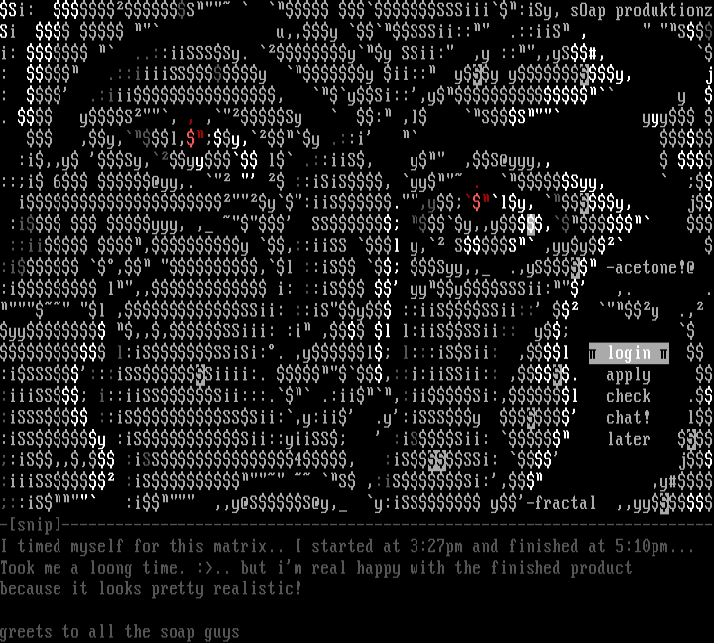 l:iSSSiSi:. ,yl l:::iSSii: ,l login :iSSS:::iSSSiiii:. ,::i:iiSSii:: ,. apply :iiiSS i::iiSSSii:::. .:ii,:iiSi:,l check .:iSSS::iSSSSii:,y:ii .y:iSSSy chat! l:iSSy :iSSii::yiiSS :iSSii: later :iS,,, :iSS4, :iSSSi: j:iiiSS :iS S,:iSSi:, ,y::iS :i ,,y@SS@y, y:iSS y-fractal ,,yy-snip-------------------------------------------------------------------------I timed myself for this matrix.. I started at 3:27pm and finished at 5:10pm...