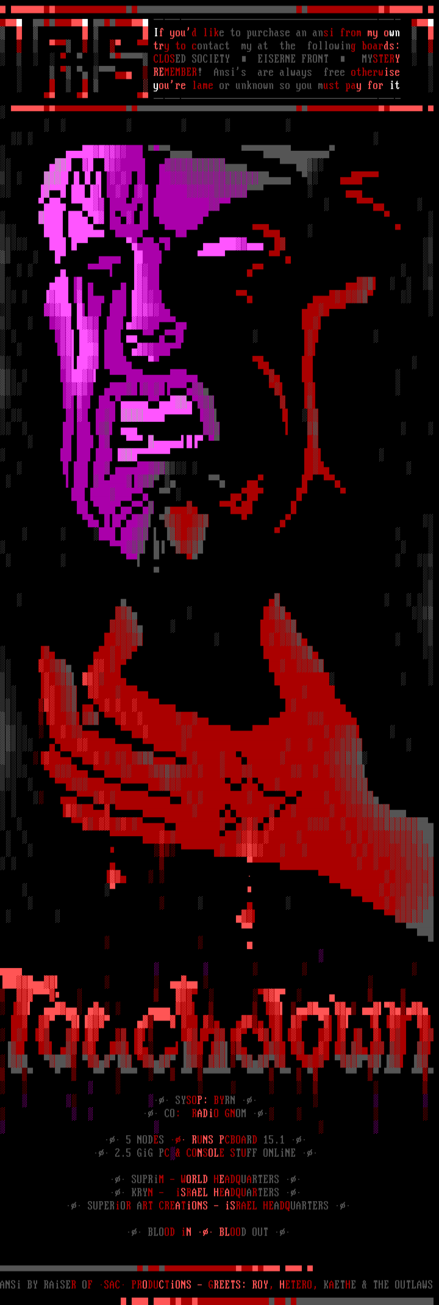 ANSi BY RAiSER OF SAC PRODUCTiONS - GREETS: ROY, HETERO, KAETHE THE OUTLAWS