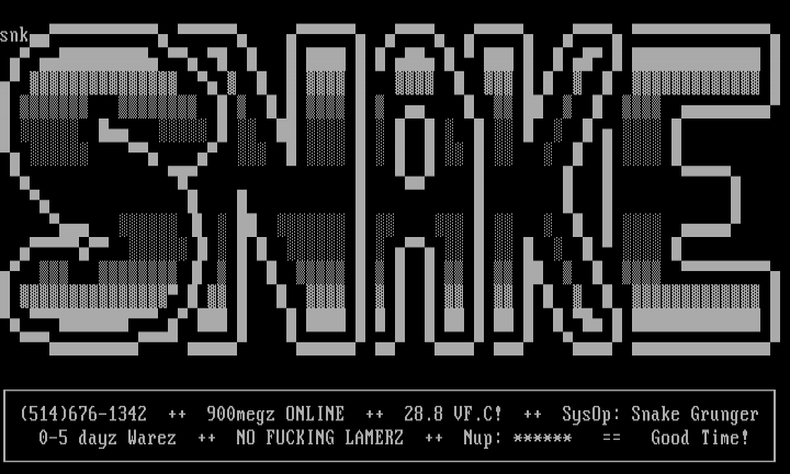 514676-1342 ++ 900megz ONLINE ++ 28.8 VF.C! ++ SysOp: Snake Grunger