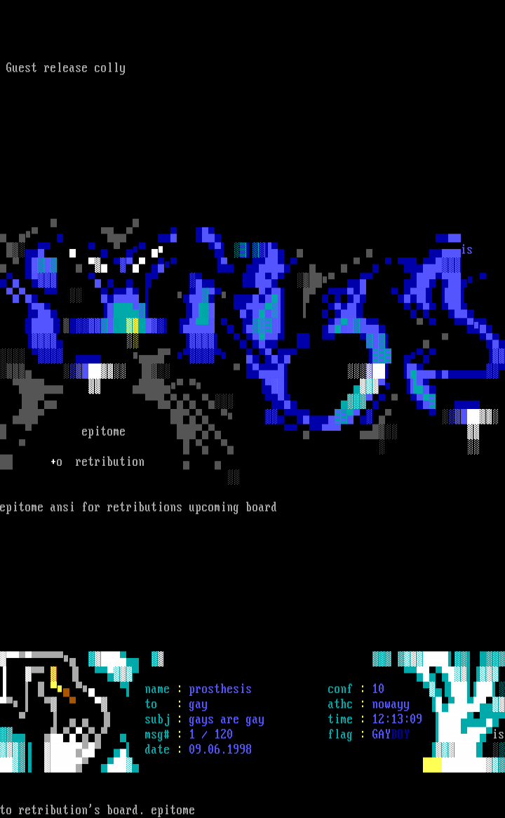 subj : gays are gay time : 12:13:09 msg : 1 / 120 flag : GAYBOY is date : 09.06.1998