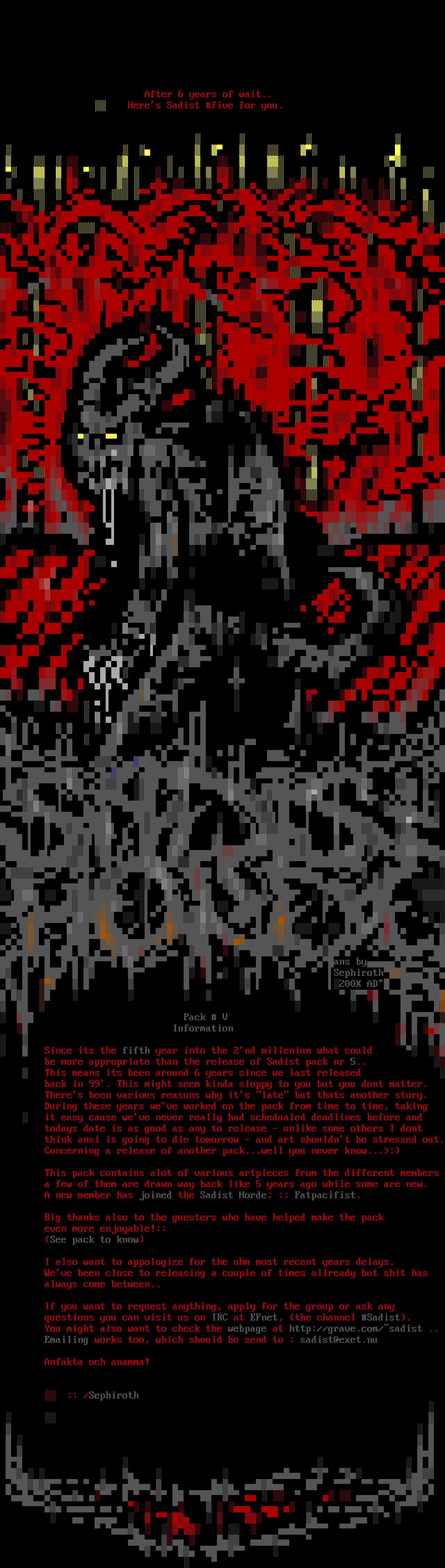 Pack V Information Since its the fifth year into the 2nd millenium what could be more appropriate than the release of Sadist pack nr 5.. This means its been around 6 years since we last released back in 99. This might seem kinda sloppy to you but you dont matter.