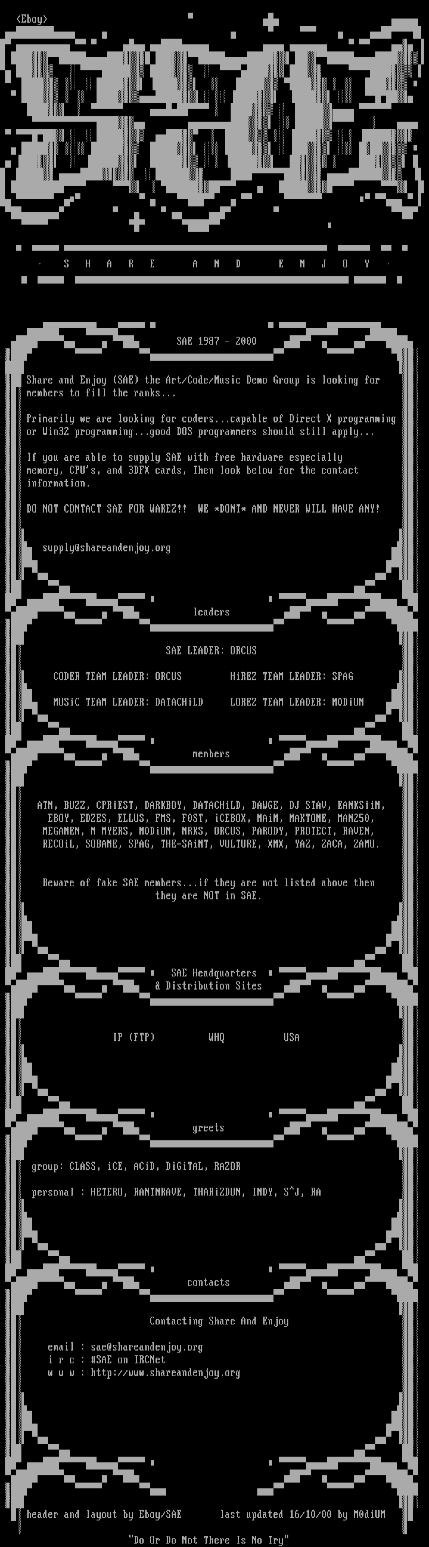 Share and Enjoy SAE the Art/Code/Music Demo Group is looking for