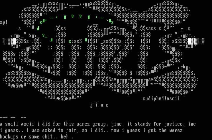a small ascii i did for this warez group, jinc. it stands for justice, inc
