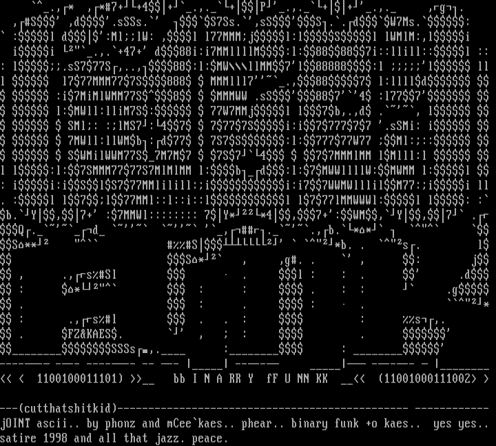 jOINT ascii.. by phonz and mCeekaes.. phear.. binary funk +o kaes.. yes yes..
