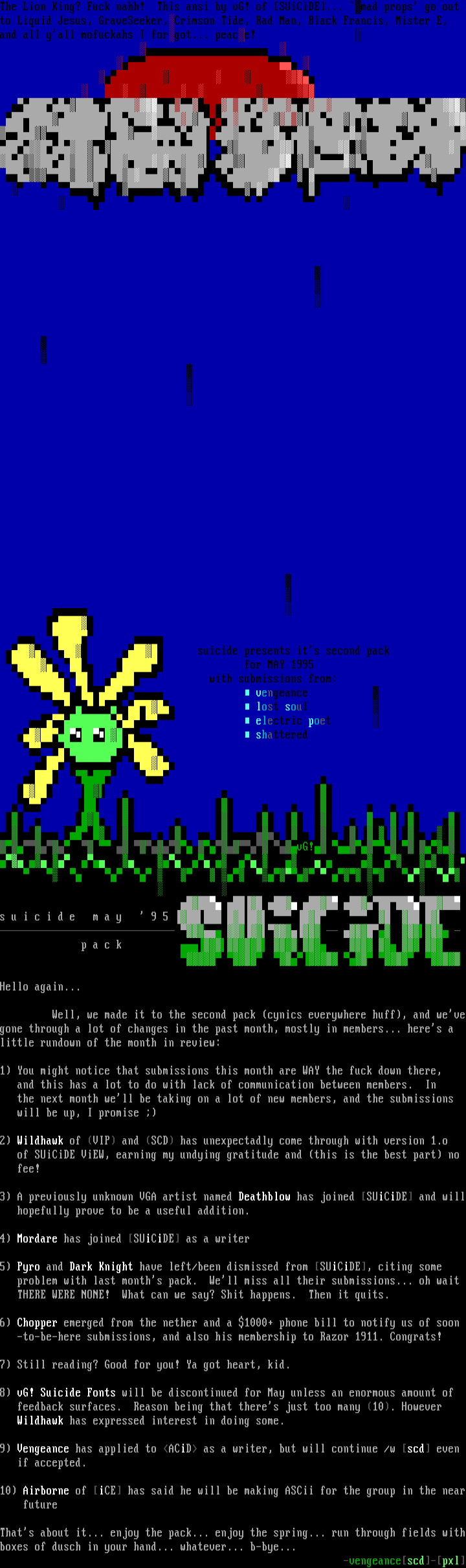 suicide presents its second pack for MAY 1995 with submissions from: vengeance lost soul electric poet shattered vG!
