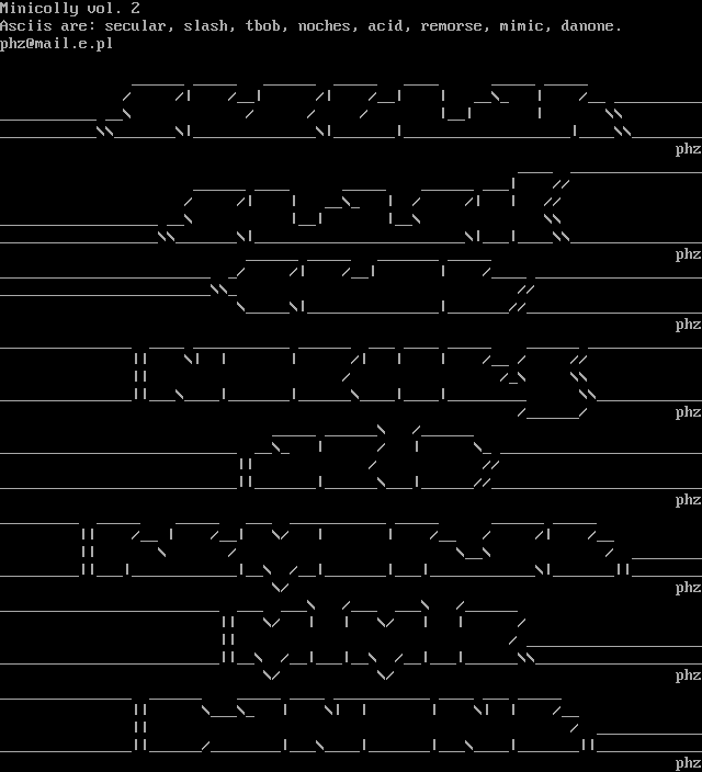 Asciis are: secular, slash, tbob, noches, acid, remorse, mimic, danone.