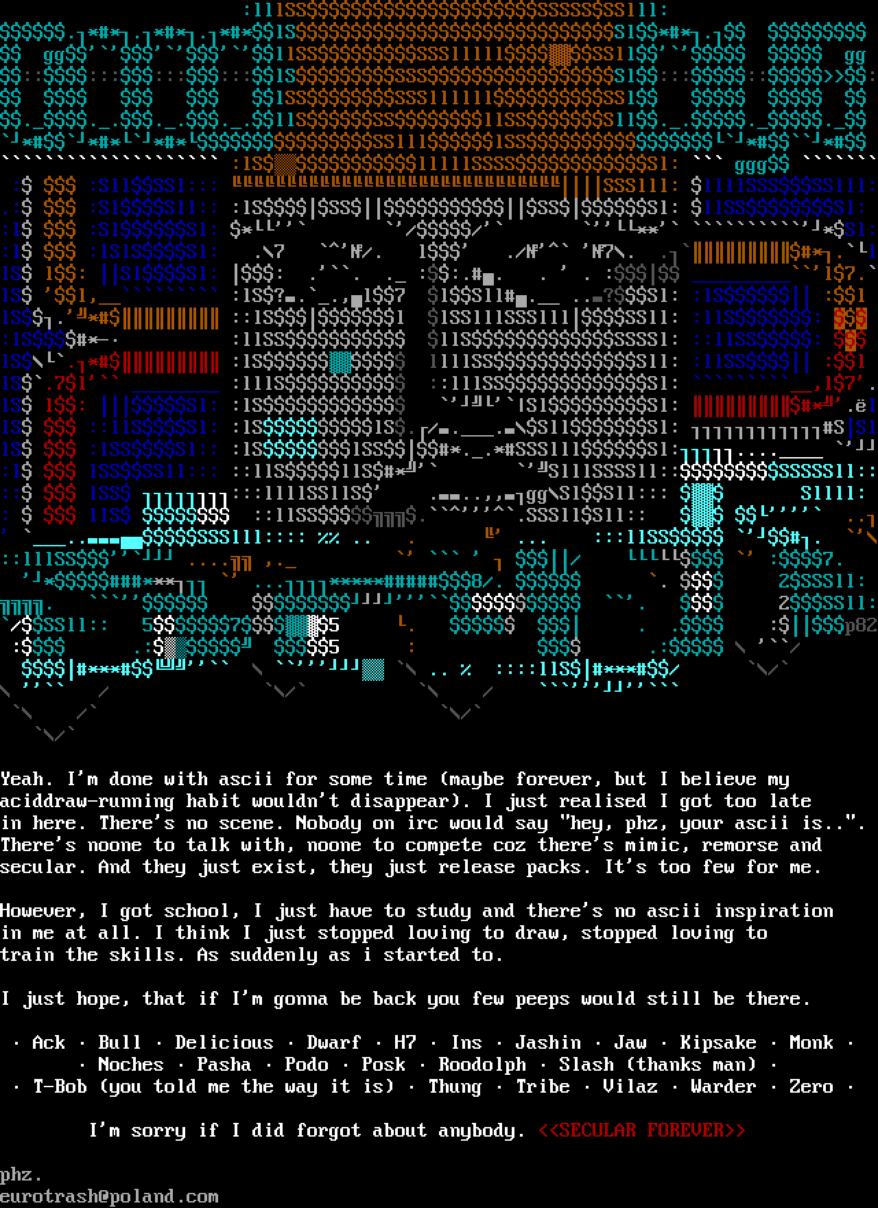 in here. Theres no scene. Nobody on irc would say hey, phz, your ascii is...