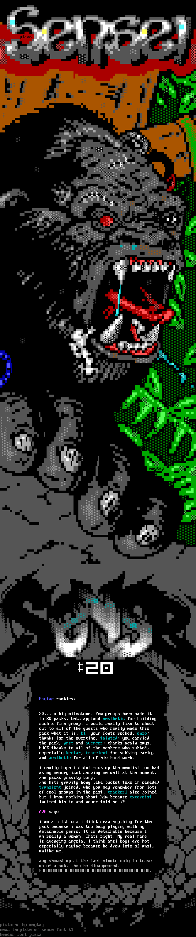 Maytag rambles: 20... a big milestone. Few groups have made it to 20 packs. Lets applaud aesthetic for building such a fine group. I would really like to shout out to all of the guests who really made this pack what it is. k1: your fonts rocked, enzo: thanks for the overtime, tainted: you carried the pack, prst and avenger: thanks again guys. HUGE thanks to all of the members who subbed, especially keetar, transient for subbing early, and aesthetic for all of his hard work. i really hope i didnt fuck up the memlist too bad as my memory isnt serving me well at the moment. /me packs gravity bong.
