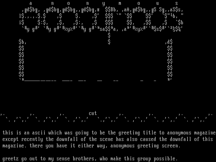 this is an ascii which was going to be the greeting title to anonymous magazine except recently the downfall of the scene has also caused the downfall of this