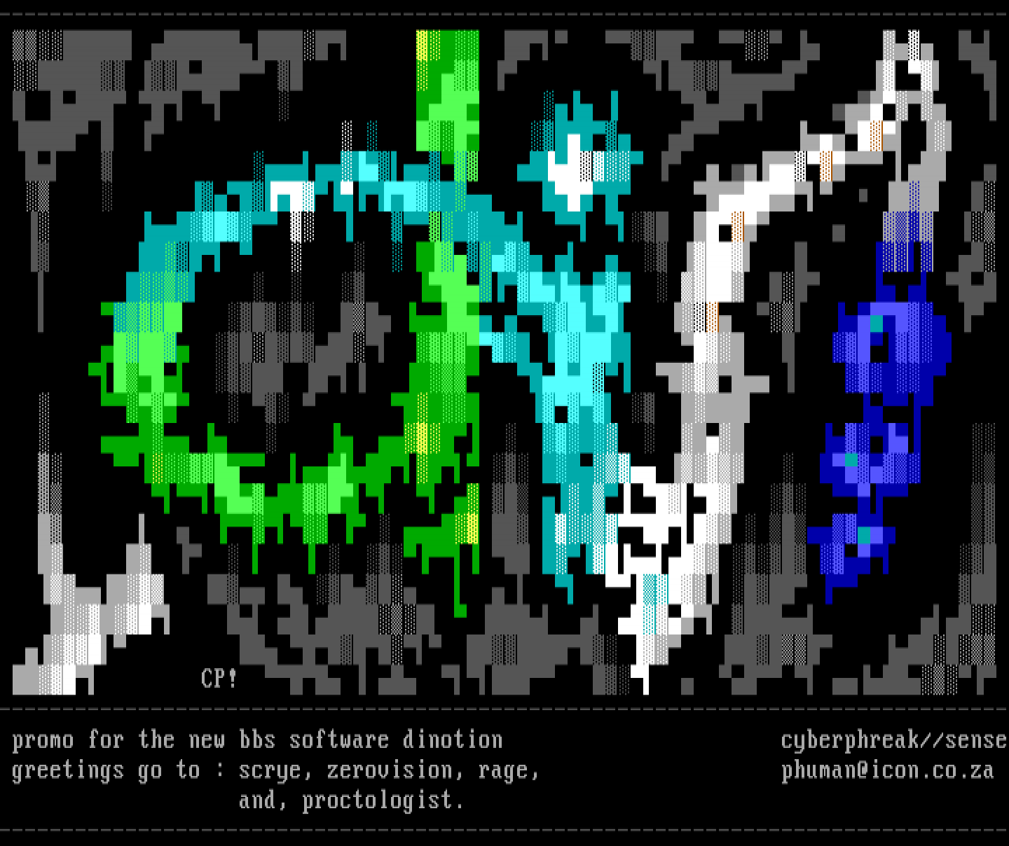 -------------------------------------------------------------------------------- promo for the new bbs software dinotion cyberphreak//sense greetings go to : scrye, zerovision, rage, phuman@icon.co.za