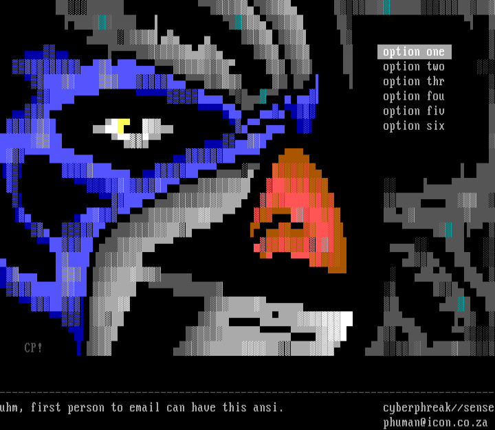 --------------------------------------------------------------------------------uhm, first person to email can have this ansi. cyberphreak//senseand if you find this text ill draw an ansi for u for free phuman@icon.co.za