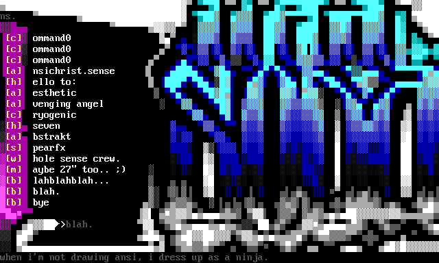 b blah. b bye blah. when im not drawing ansi, i dress up as a ninja.