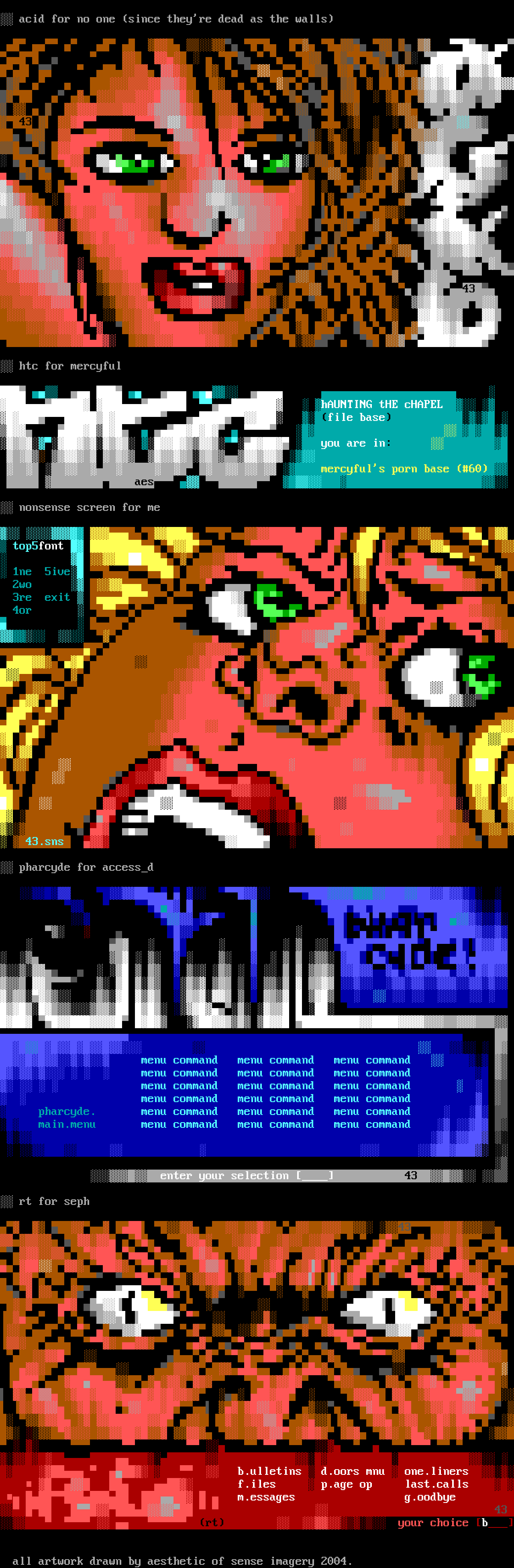 b.ulletins d.oors mnu one.liners f.iles p.age oplast.calls m.essages g.oodbye 43 rt your choice b
