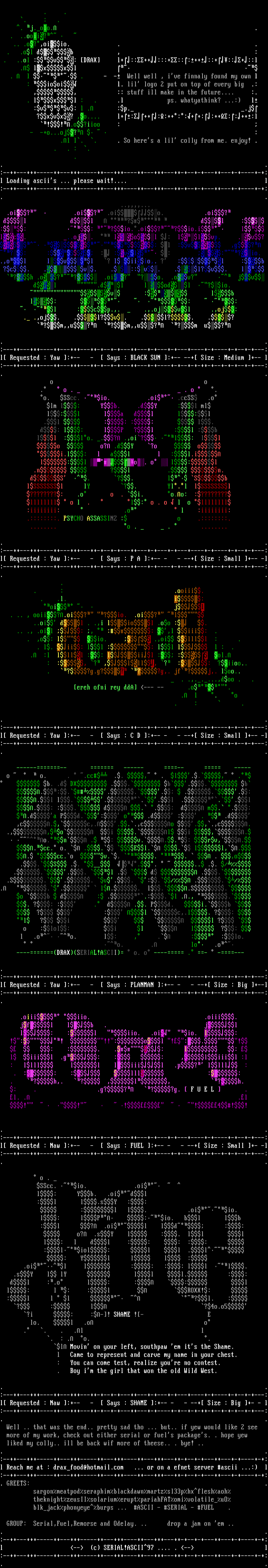. .:--++---+++-----++---+++-----++---+++----++---+++---++-+--+-+---++---+-+----+-+:l Reach me at : draxfood@hotmail.com ... or on a efnet server ascii ...: l:--++---+++-----++---+++-----++---+++----++---+++---++-+--+-+---++---+-+----+-+:. GREETS: . sargonmeatpodseraphimblackdawnmartzsl33phxfleshaoh