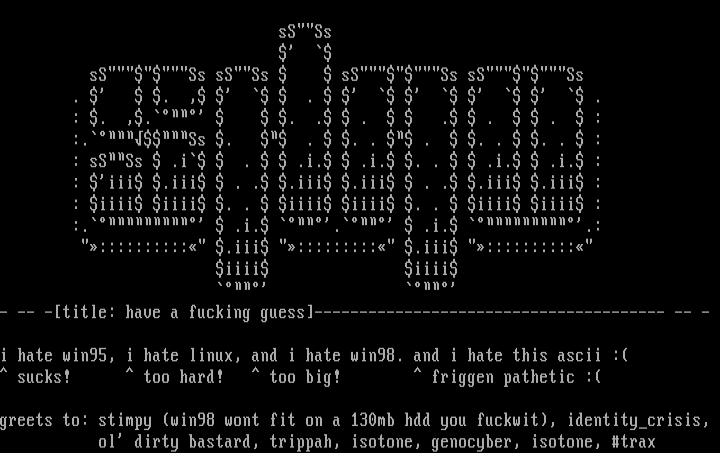 i hate win95, i hate linux, and i hate win98. and i hate this ascii :