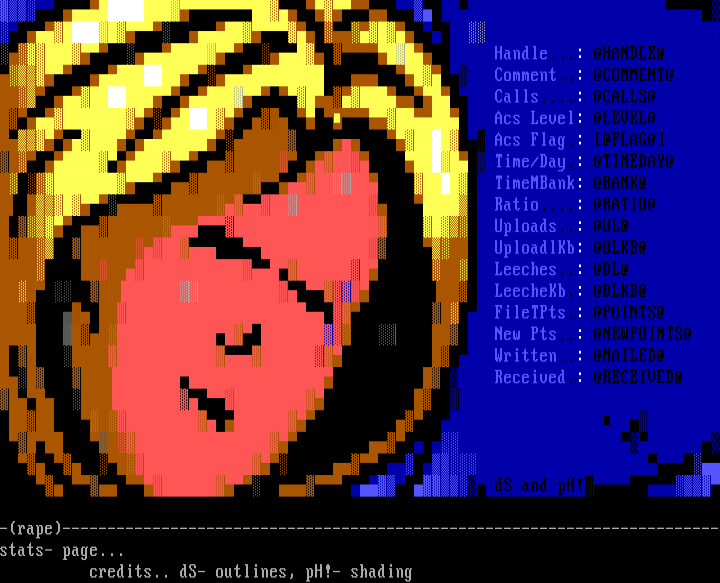 Handle...: @HANDLE@ Comment..: @COMMENT@ Calls....: @CALLS@ Acs Level: @LEVEL@ Acs Flag.: @FLAG@ Time/Day.: @TIMEDAY@ TimeMBank: @BANK@ Ratio....: @RATIO@ Uploads..: @UL@