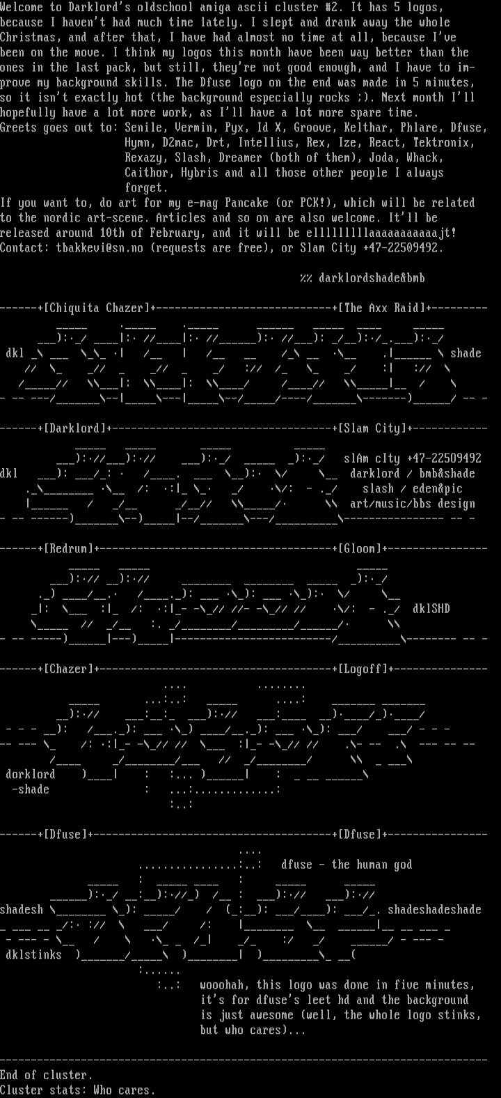 Welcome to Darklords oldschool amiga ascii cluster 2. It has 5 logos,