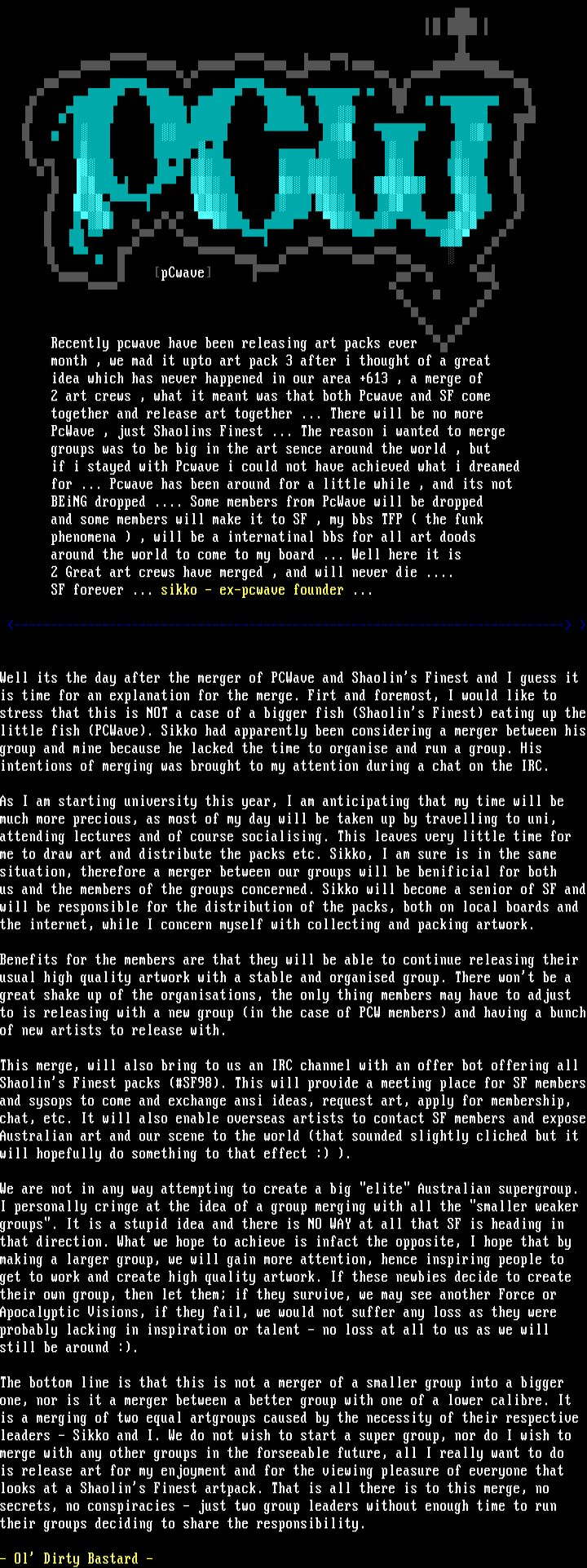 Shaolins Finest packs SF98. This will provide a meeting place for SF membersand sysops
