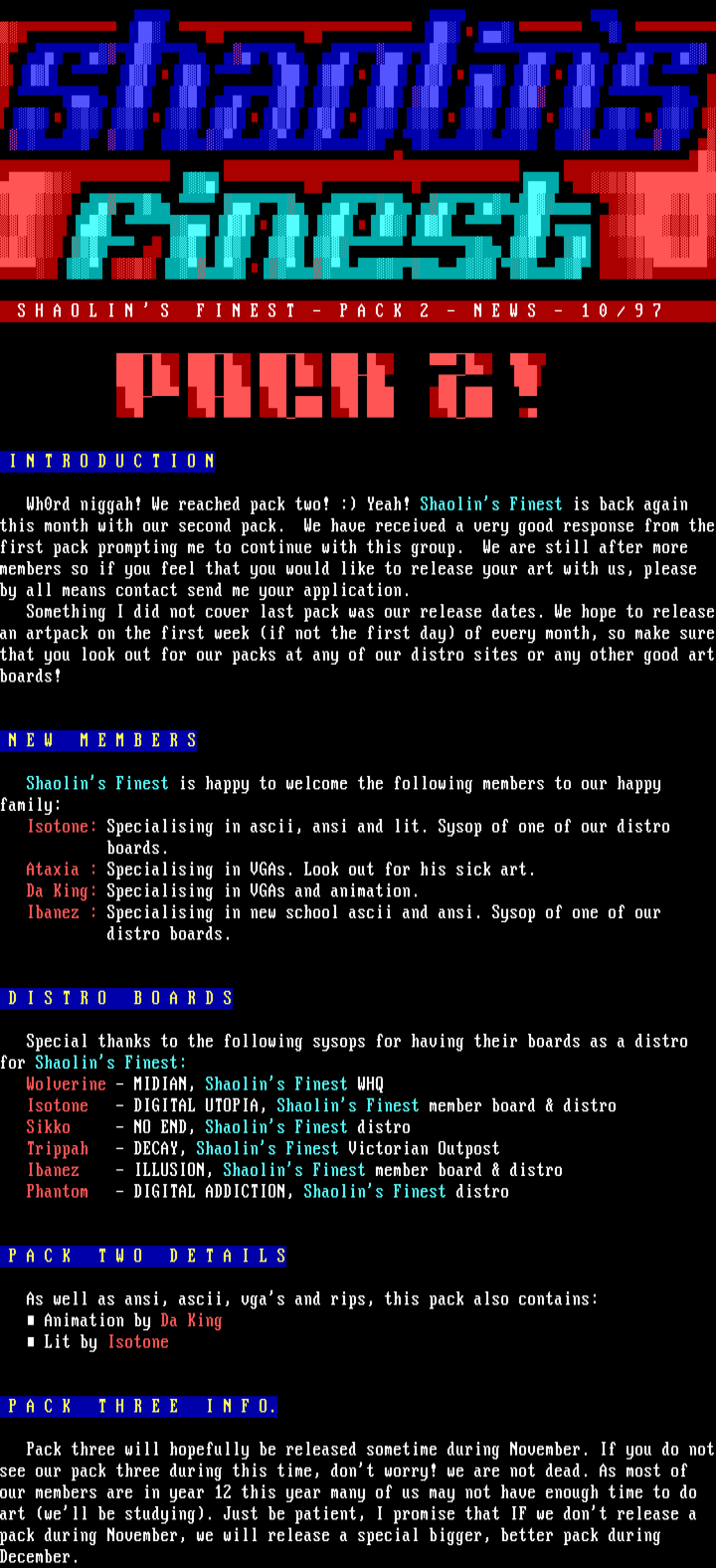 Isotone: Specialising in ascii, ansi and lit. Sysop of one of our distro