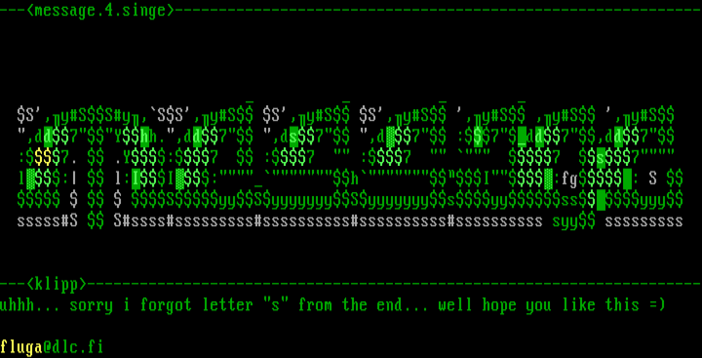 ---klipp----------------------------------------------------------------------uhhh... sorry i forgot letter s from the end... well hope you like this
