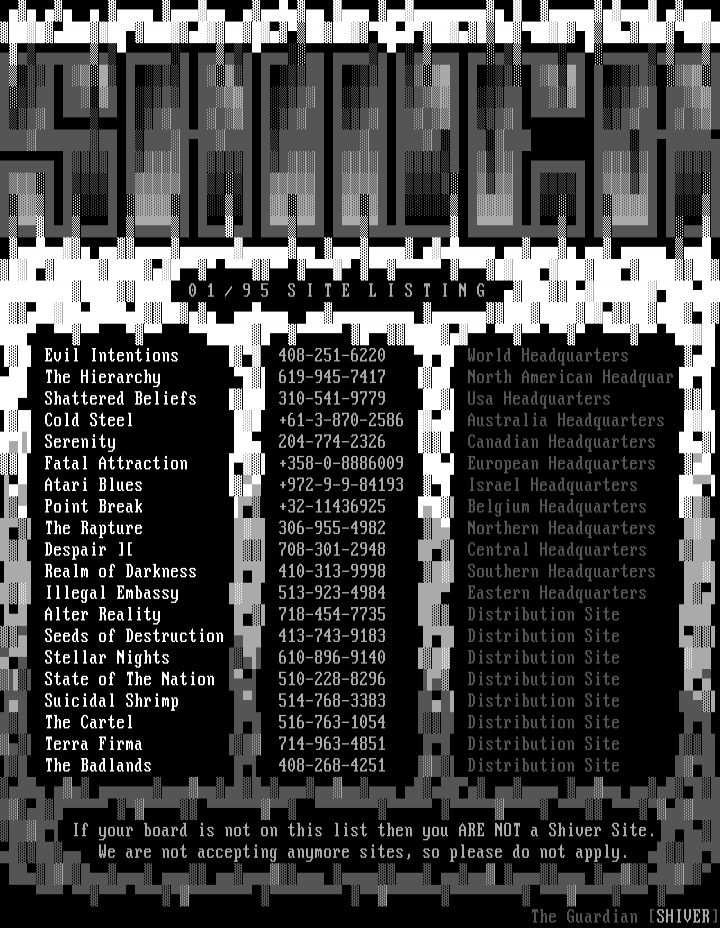0 1 / 9 5 S I T E L I S T I N G Evil Intentions 408-251-6220 World Headquarters The Hierarchy 619-945-7417 North American Headquar