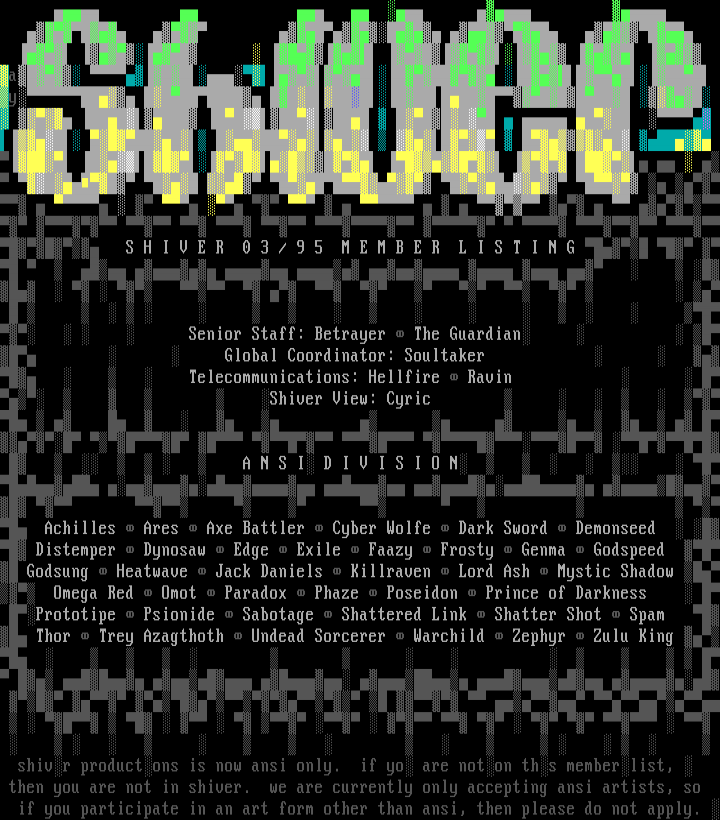 S H I V E R 0 3 / 9 5 M E M B E R L I S T I N G Senior Staff: Betrayer The Guardian Global Coordinator: Soultaker Telecommunications: Hellfire Ravin Shiver View: Cyric A N S I D I V I S I O N Achilles Ares Axe Battler Cyber Wolfe Dark Sword Demonseed Distemper Dynosaw Edge Exile Faazy Frosty Genma Godspeed Godsung Heatwave Jack Daniels Killraven Lord Ash Mystic Shadow Omega Red Omot Paradox Phaze Poseidon Prince of Darkness Prototipe Psionide Sabotage Shattered Link Shatter Shot Spam Thor Trey Azagthoth Undead Sorcerer Warchild Zephyr Zulu King
