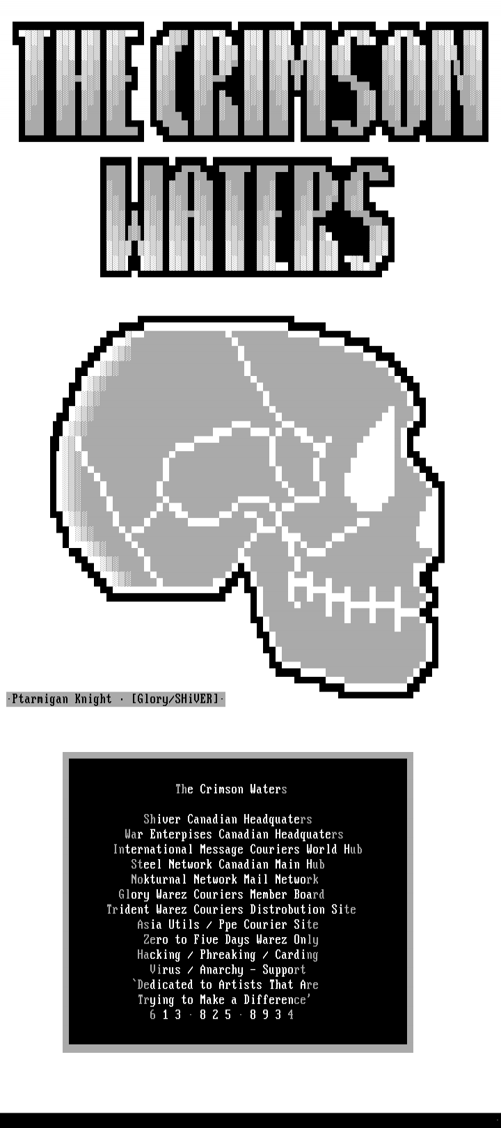 Ptarmigan Knight Glory/SHiVER The Crimson Waters Shiver Canadian Headquaters War Enterpises Canadian Headquaters International Message Couriers World Hub Steel Network Canadian Main Hub Nokturnal Network Mail Network Glory Warez Couriers Member Board Trident Warez Couriers Distrobution Site Asia Utils / Ppe Courier Site Zero to Five Days Warez Only Hacking / Phreaking / Carding Virus / Anarchy - Support Dedicated to Artists That Are Trying to Make a Difference 6 1 3 8 2 5 8 9 3 4