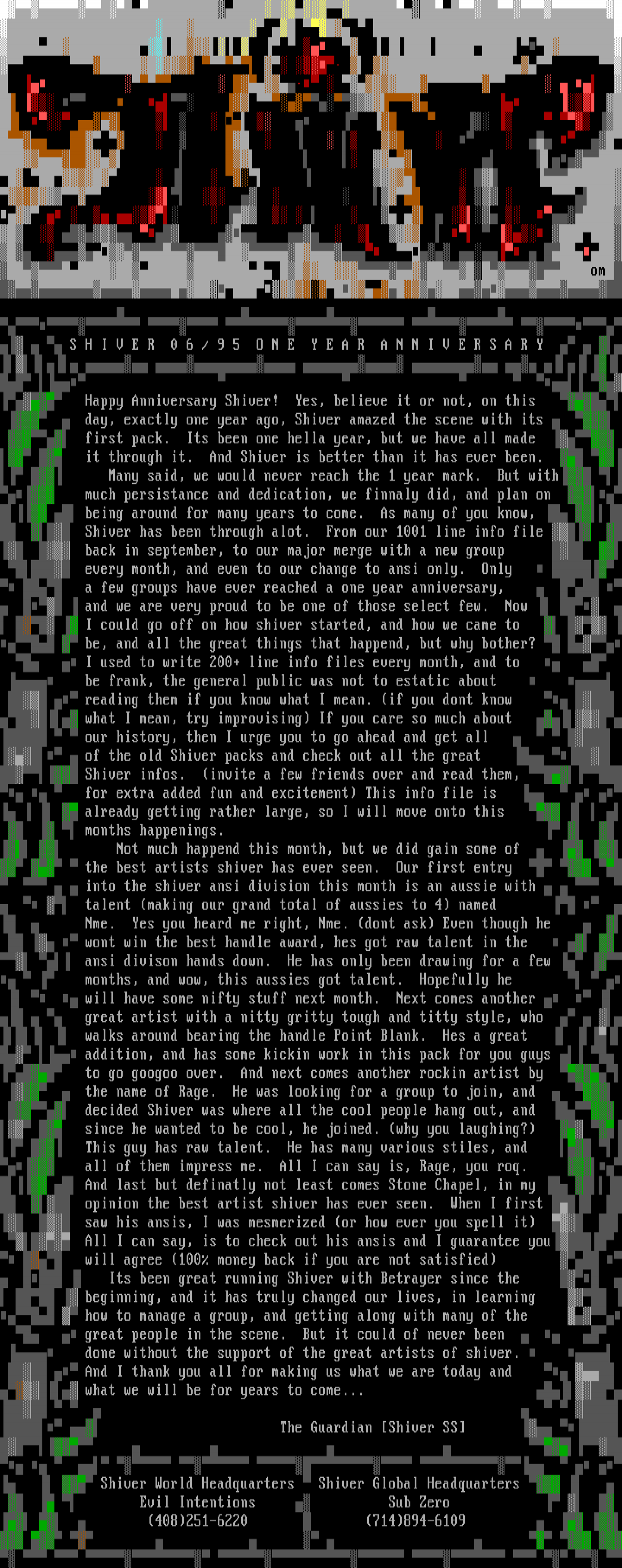 it through it. And Shiver is better than it has ever been. Many said, we would never reach the 1 year mark. But with much persistance and dedication, we finnaly did, and plan on being around for many years to come. As many of you know, Shiver has been through alot. From our 1001 line info file back in september, to our major merge with a new group every month, and even to our change to ansi only. Only