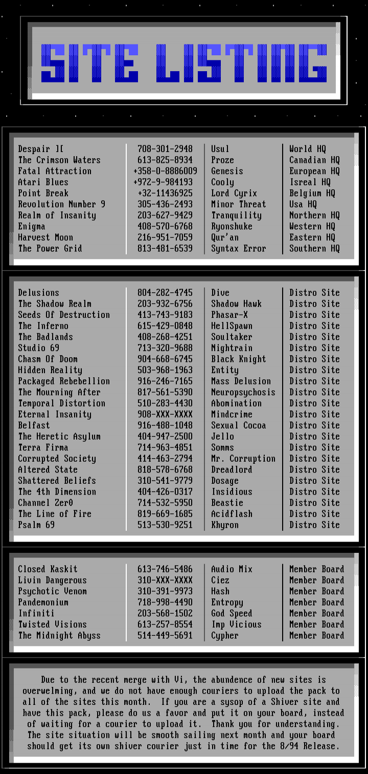 Despair 7O8-3O1-2948 Usul World HQ The Crimson Waters 613-825-8934 Proze Canadian HQ Fatal Attraction +358-O-8886OO9 Genesis European HQ Atari Blues +972-9-984193 Cooly Isreal HQ Point Break +32-11436925 Lord Cyrix Belgium HQ Revolution Number 9 3O5-436-2493 Minor Threat Usa HQ Realm of Insanity 2O3-627-9429 Tranquility Northern HQ Enigma 4O8-57O-6768 Ryonshuke Western HQ Harvest Moon 216-951-7O59 Quran Eastern HQ The Power Grid 813-481-6539 Syntax Error Southern HQ Delusions 8O4-282-4745 Dive Distro Site The Shadow Realm 2O3-932-6756 Shadow Hawk Distro Site Seeds Of Destruction 413-743-9183 Phasar-X Distro Site The Inferno 615-429-O848 HellSpawn Distro Site The Badlands 4O8-268-4251 Soultaker Distro Site Studio 69 713-32O-9688 Nightrain Distro Site Chasm Of Doom 9O4-668-6745 Black Knight Distro Site Hidden Reality 5O3-968-1963 Entity Distro Site Packaged Rebebellion 916-246-7165 Mass Delusion Distro Site The Mourning After 817-561-539O Neuropsychosis Distro Site Temporal Distortion 51O-283-443O Abomination Distro Site Eternal Insanity 9O8-XXX-XXXX Mindcrime Distro Site Belfast 916-488-1O48 Sexual Cocoa Distro Site The Heretic Asylum 4O4-947-25OO Jello Distro Site Terra Firma 714-963-4851 Somms Distro Site Corrupted Society 414-463-2794 Mr. Corruption Distro Site Altered State 818-578-6768 Dreadlord Distro Site Shattered Beliefs 31O-541-9779 Dosage Distro Site The 4th Dimension 4O4-426-O317 Insidious Distro Site Channel Zer0 714-532-595O Beastie Distro Site The Line of Fire 819-669-1685 Acidflash Distro Site Psalm 69 513-53O-9251 Khyron Distro Site Closed Kaskit 613-746-5486 Audio Mix Member Board Livin Dangerous 31O-XXX-XXXX Ciez Member Board Psychotic Venom 31O-391-9973 Hash Member Board Pandemonium 718-998-449O Entropy Member Board Infiniti 2O3-568-15O2 God Speed Member Board Twisted Visions 613-257-8554 Imp Vicious Member Board The Midnight Abyss 514-449-5691 Cypher Member Board Due to the recent merge with Vi, the abundence of new sites is overwelming, and we do not have enough couriers to upload the pack to all of the sites this month. If you are a sysop of a Shiver site and have this pack, please do us a favor and put it on your board, instead of waiting for a courier to upload it. Thank you for understanding. The site situation will be smooth sailing next month and your board should get its own shiver courier just in time for the 8/94 Release.