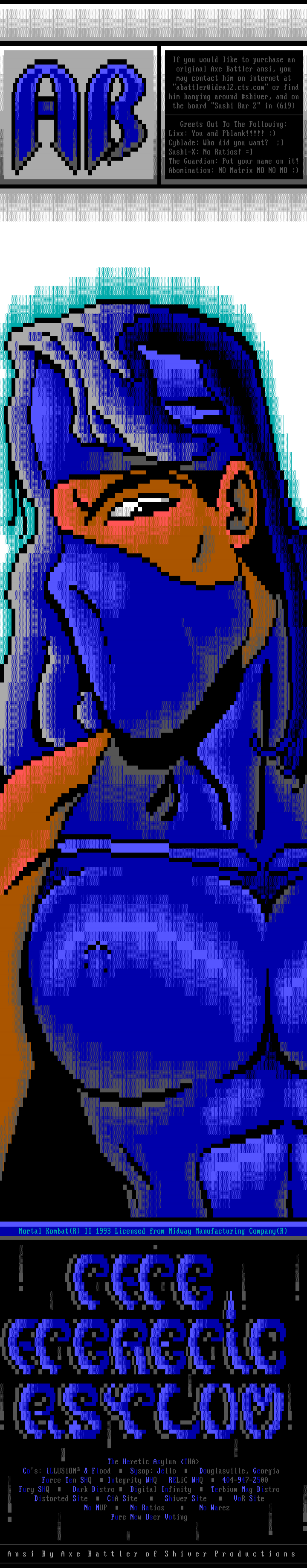 If you would like to purchase an original Axe Battler ansi, you may contact him on internet at abattler@ideal2.cts.com or find him hanging around shiver, and on the board Sushi Bar Z in 619 Greets Out To The Following: Lixx: You and Pblank!!!!! : Cyblade: Who did you want? Sushi-X: No Ratios! The Guardian: Put your name on it! Abomination: NO Matrix NO NO NO :