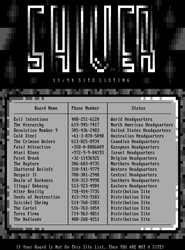Board Name Phone Number Status Evil Intentions 408-251-6220 World Headquarters The Hierarchy 619-945-7417 North American Headquarters Revolution Number 9 305-436-2483 United States Headquarters Cold Steel +61-3-870-5848 Australian Headquarters The Crimson Waters 613-825-8934 Canadian Headquarters Fatal Attraction +358-0-8886009 European Headquarters Atari Blues +972-9-9-84193 Israel Headquarters Point Break +32-11436925 Belgium Headquarters The Rapture 306-683-0735 Northern Headquarters