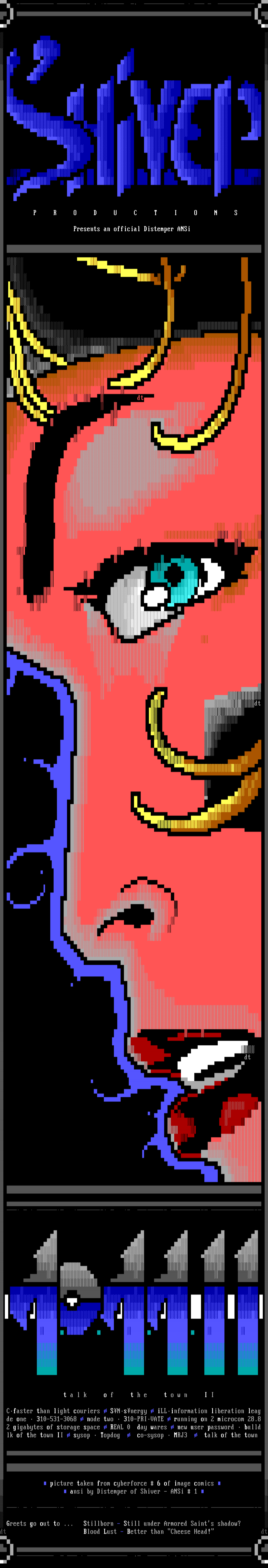 - -- - P R O D U C T I O N S Presents an official Distemper ANSi dt dt dt -- - --- -- -- t a l k o f t h e t o w n I I Cfaster than light couriers SNsnergy iLLinformation liberation leag de one 310-531-3068 node two 310-PRIVATE running on 2 microcom 28.8 2 gigabytes of storage space REAL 0 day wares new user password bulld lk of the town II sysop Topdog co-sysop MRJ3 talk of the town picture taken from cyberforce 6 of image comics ansi by Distemper of Shiver - ANSi 1 -- - --- -- -- Greets go out to ... Stillborn - Still under Armored Saints shadow? dt Blood Lust - Better than Cheese Head! dt - --