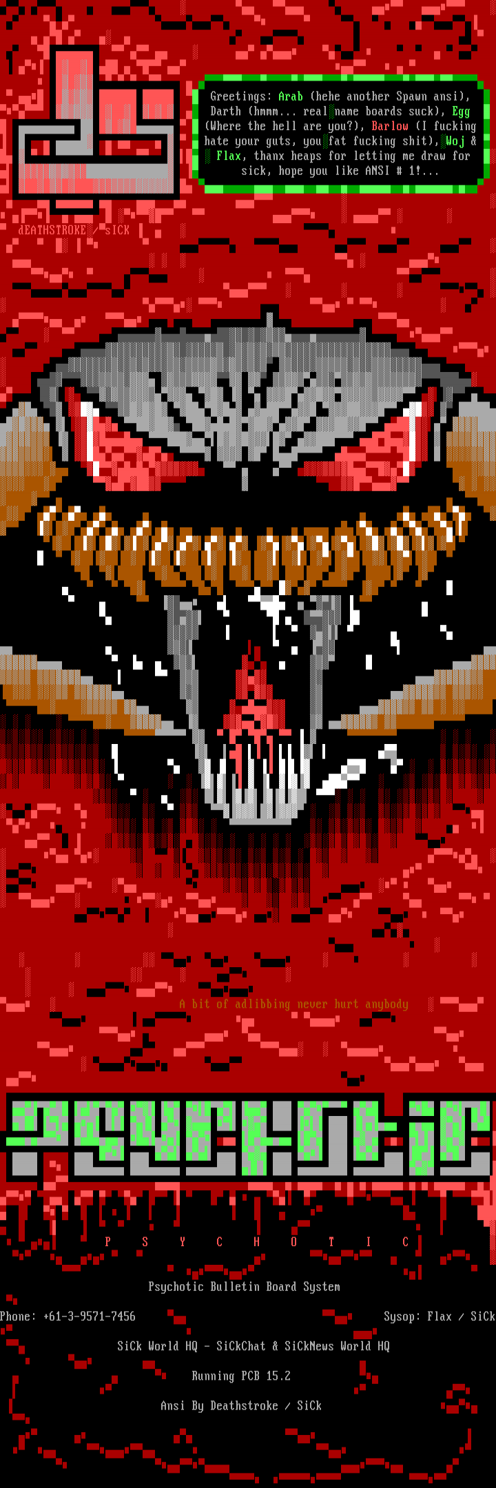 Greetings: Arab hehe another Spawn ansi, Darth hmmm... realname boards suck, Egg Where the hell are you?, Barlow I fucking hate your guts, youfat fucking shit,Woj Flax, thanx heaps for letting me draw for