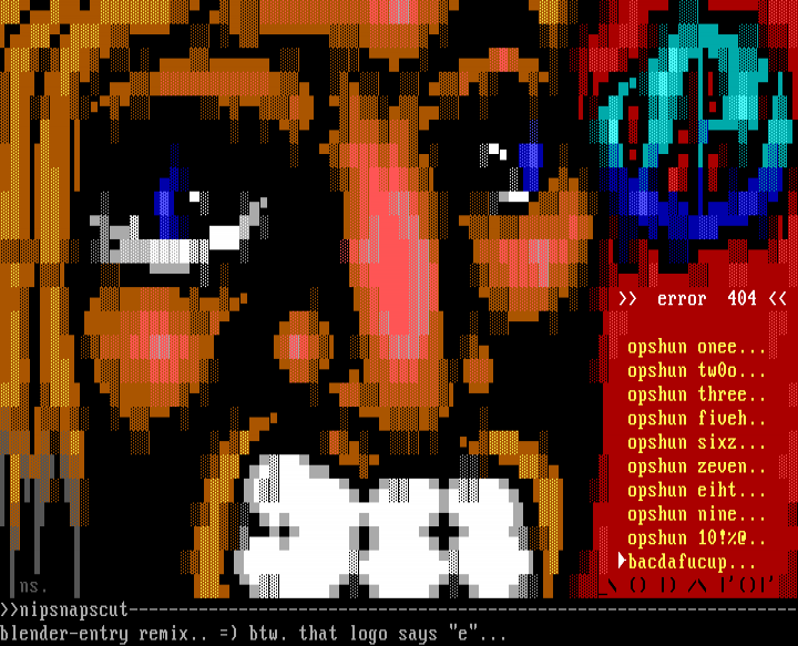error404 opshun onee... opshun tw0o... opshun three.. opshun fiveh.. opshun sixz... opshun zeven.. opshun eiht... opshun nine... opshun 10!@.. bacdafucup... ns. / nipsnapscut-------------------------------------------------------------------blender-entry remix.. btw. that logo says e...
