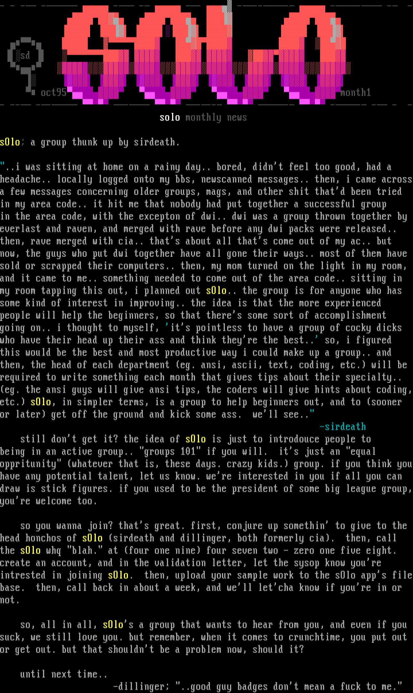 eg. the ansi guys will give ansi tips, the coders will give hints about coding,etc. sOlo, in simpler terms, is a group to help beginners out, and to sooner