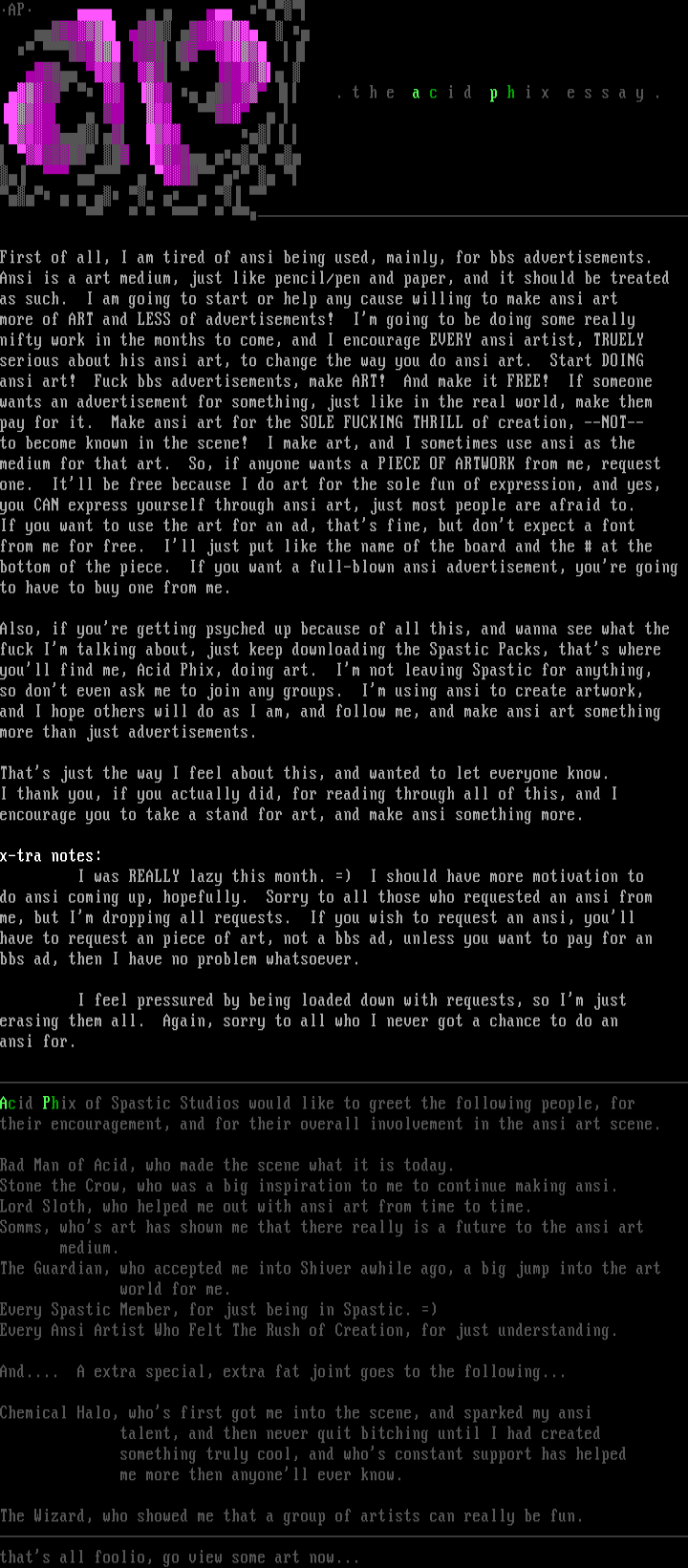 their encouragement, and for their overall involvement in the ansi art scene.