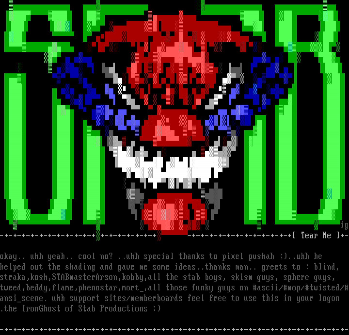 tweed,beddy,flame,phenostar,mort,all those funky guys on ascii/mop/twisted/ansiscene. uhh support sites/memberboards feel free to use this in your logon