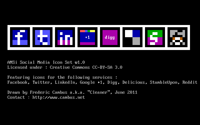+1 digg ANSi Social Media Icon Set v1.0 Licensed under : Creative Commons CC-BY-SA 3.0 Featuring icons for the following services : Facebook, Twitter, LinkedIn, Google +1, Digg, Delicious, StumbleUpon, Reddit Drawn by Frederic Cambus a.k.a. Cleaner, June 2011 Contact : http://www.cambus.net