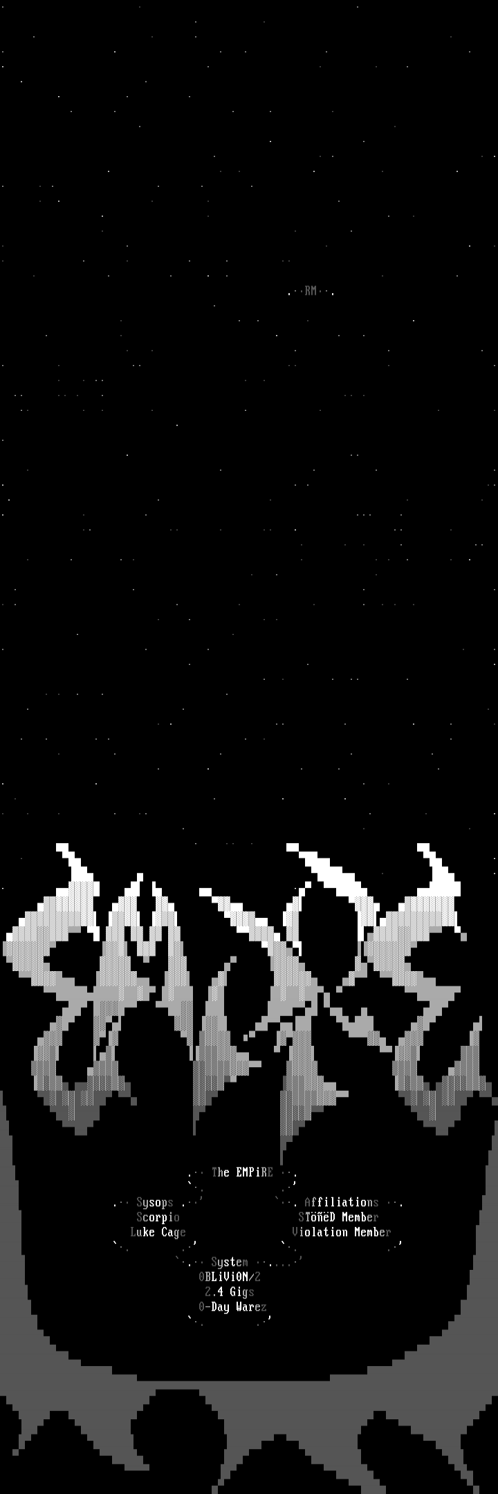 . The EMPiRE . . . . Sysops . . Affiliations . Scorpio STD Member Luke Cage Violation Member . . . . . System .... 0BLiVi0N/2 2.4 Gigs 0-Day Warez . .