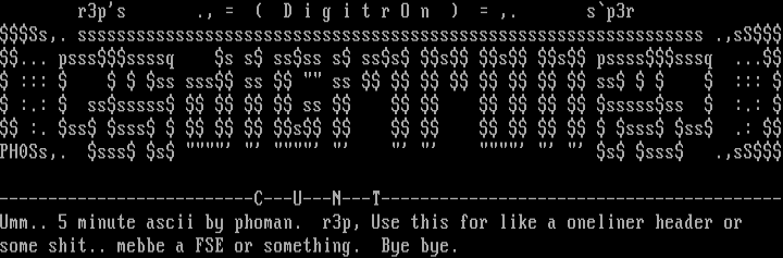 --------------------------C---U---N---T-----------------------------------------Umm.. 5 minute ascii by phoman. r3p, Use this for like a oneliner header or