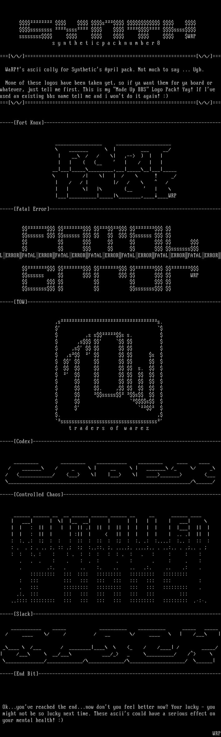WaRP!s ascii colly for Synthetics April pack. Not much to say ... Ugh.