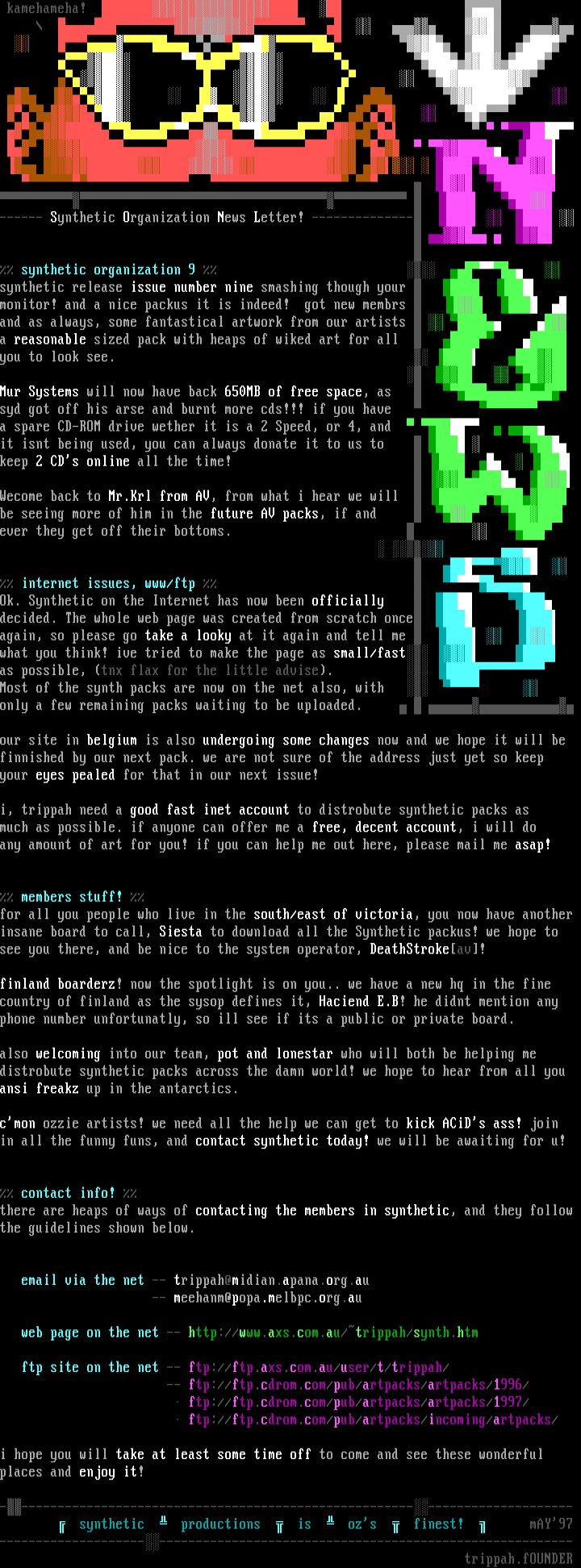synthetic organization 9 synthetic release issue number nine smashing though your monitor! and a nice packus it is indeed! got new membrs and as always, some fantastical artwork from our artists a reasonable sized pack with heaps of wiked art for all you to look see.