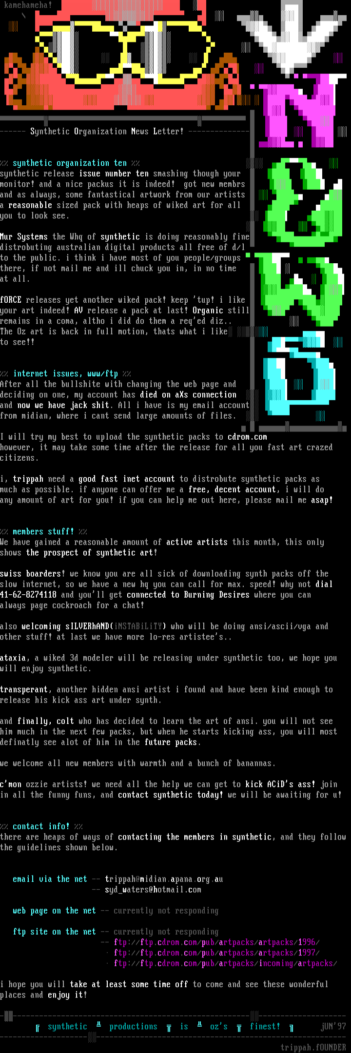 synthetic release issue number ten smashing though your monitor! and a nice packus it is indeed! got new membrs and as always, some fantastical artwork from our artists a reasonable sized pack with heaps of wiked art for all you to look see.