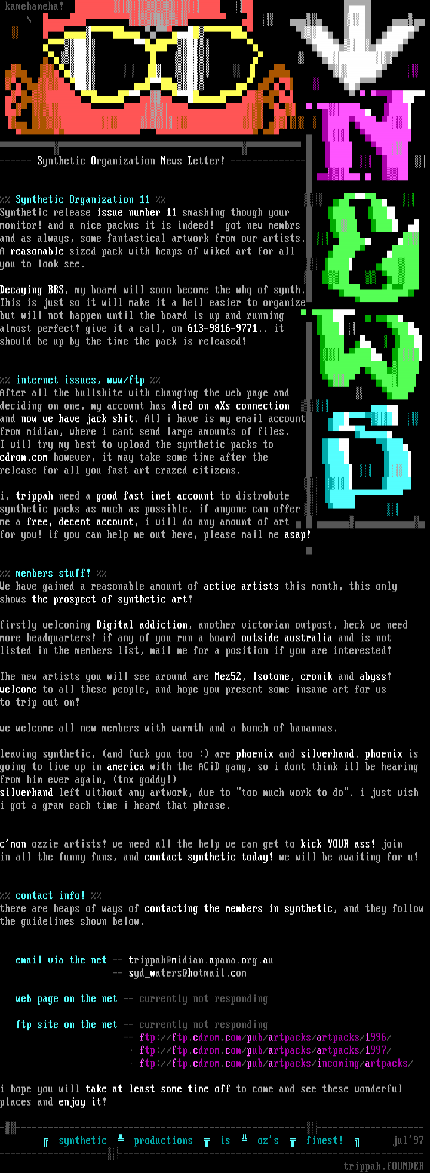Synthetic release issue number 11 smashing though your monitor! and a nice packus it is indeed! got new membrs and as always, some fantastical artwork from our artists. A reasonable sized pack with heaps of wiked art for all you to look see.