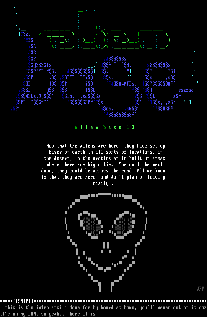 !SNIP! this is the intro ansi i done for by board at home, youll never get on it cozits on my LAN. so yeah... here it is.